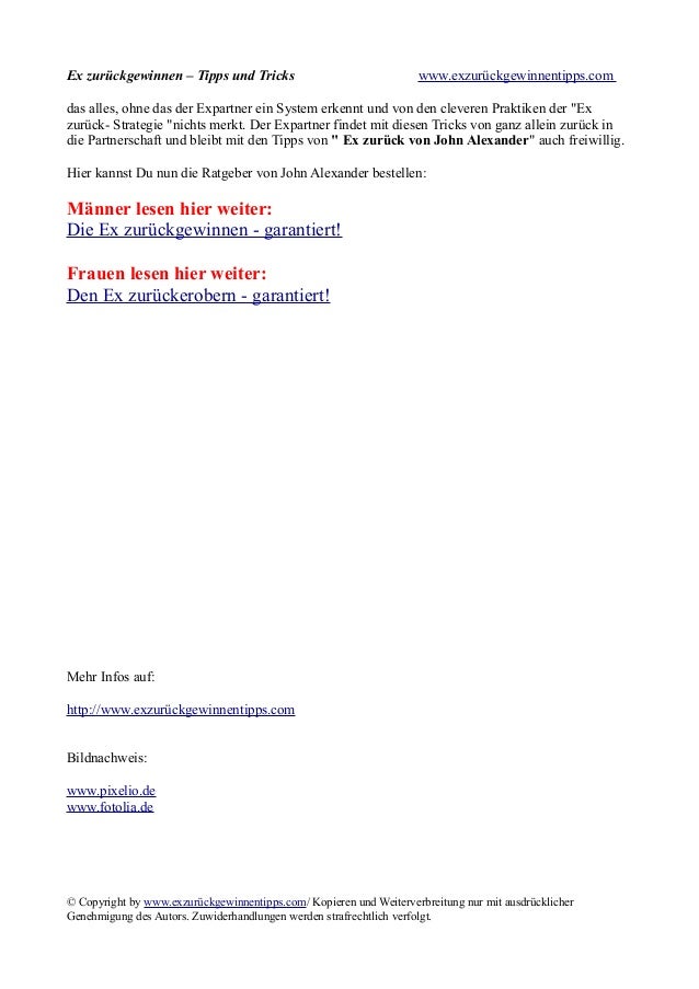 Obwohl ich dies nicht wollte, erzählte er meiner nun Ex-Freundin wie leid ich Ihm tue, und wie dreckig es mir gehen würde. Also: Wie solltest du dich weiterentwickeln?. Sie wird bekocht, kriegt die Wäsche gewaschen, bei mir sieht es nunmal nicht so aus. Und was Dein Anteil daran war. Mein Name ist Philip Mcmullen. Warum scheitern so viele aufgewärmte Beziehungen? Nun, da du den generellen Inhalt des E-Books erfahren hast, ist es Zeit, dich zu entscheiden, ob es sich hierbei um den Guide handelt, nachdem du suchst, um dich dabei zu unterstützen, deinen Ex-Parter zurück in deine Arme zu schließen. Er hat den Zauber gesprochen und am zweiten Tag war es gegen 16 Uhr.